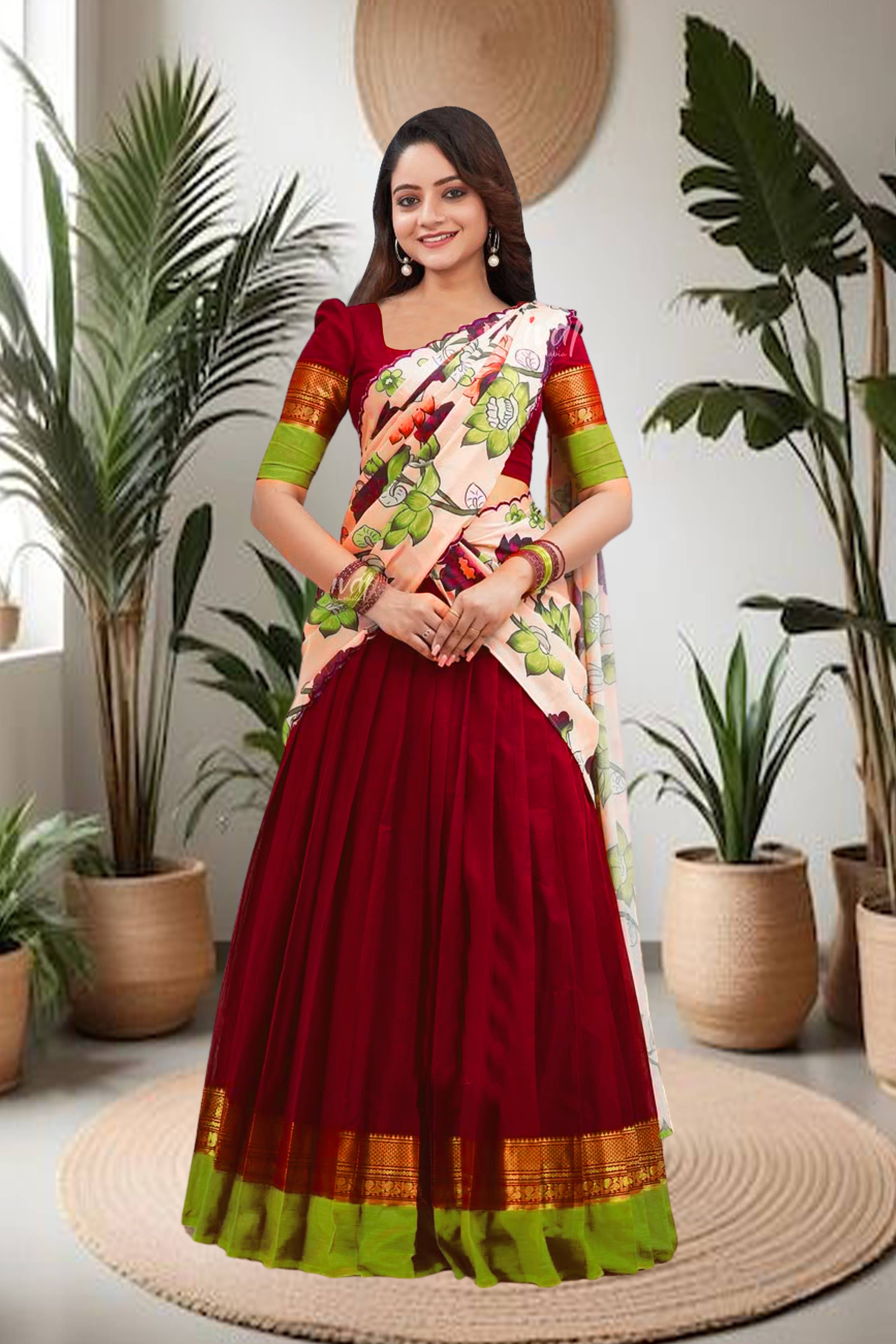Topwear Fabric: Art Silk Bottomwear Fabric: Banglori Silk Dupatta Fabric: Viscose Silk type: Choli And Dupatta Top Print or Pattern Type: Aari Work Bottom Print or Pattern Type: Jacquard Dupatta Print or Pattern Type: Aari Work Sizes: Free Size (Lehenga Waist Size: 45 in, Lehenga Length Size: 45 in, Duppatta Length Size: 2.25 m) Country of Origin: India