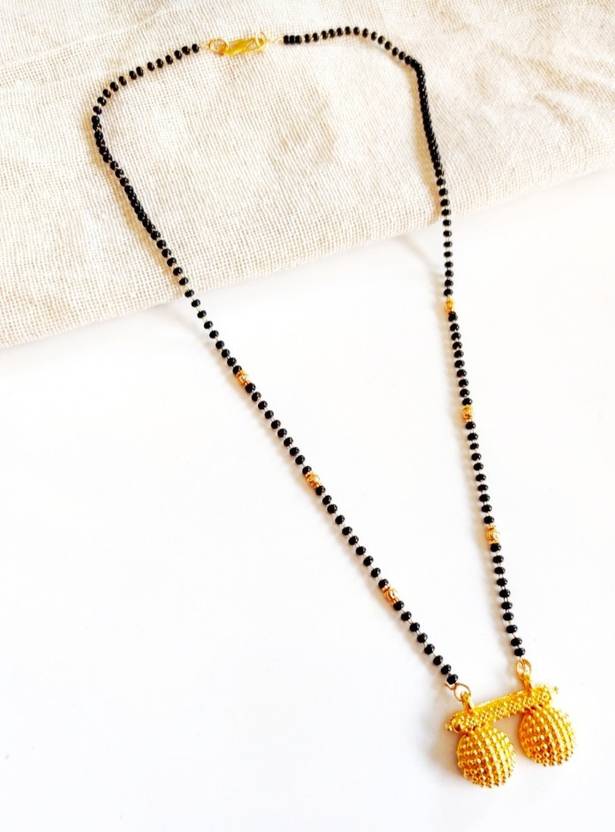 This mangalsutra for women is made of brass... Its made of three diamond stones. (AD).Its size also 18 inches. Mae entirely with black beads.You can use it daily .Just keep away from water and perfume.Mangalsutra locks in S-hook.Its perfect with any outfit to make your daily use.