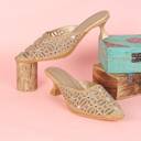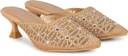Step out in style with these exquisite mules, perfect for adding a touch of sophistication to any outfit. The closed-toe upper features intricate gold embroidery in a geometric pattern, beautifully accented with an array of shimmering clear rhinestones and smaller white pearl-like beads, creating a dazzling visual effect.Designed for both comfort and elegance, these slip-on mules boast a chic kitten heel with a distinctive flared base in a coordinating golden-brown tone, providing a stable yet stylish lift. The sleek pointed toe silhouette elongates the leg, while the open-back design ensures easy wearability. Ideal for festive occasions, evening events, or adding a glamorous touch to your everyday attire, these embellished mules are a must-have addition to your footwear collection.