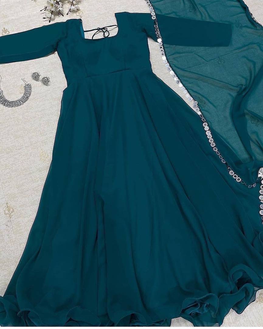 Gown: High-quality georgette for a flowy and lightweight feel, Dupatta: Chiffon with a gold-trim border for added style, Color: Solid black for a timeless and versatile appeal, Sleeves: Full-length sleeves for a refined and modest look, Neckline: Square neck for a flattering silhouette, Fit Type: Flared Anarkali design to enhance movement and elegance, Length: Floor-length for a regal appearance, Style: Traditional yet modern with minimalistic detailing