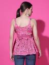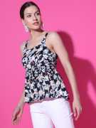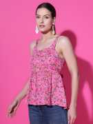 DESIGN: Trendy peplum top featuring a charming floral print pattern with pink and purple blooms on a white background, perfect for casual and semi-formal occasions. STYLE: Sleeveless silhouette with comfortable strappy shoulders and a flattering empire waistline that creates an elegant feminine look. VERSATILITY: Easy-to-pair design that complements jeans, trousers, or skirts, making it suitable for various outfit combinations. FABRIC: Lightweight material with an all-over floral print that ensures comfort and breathability during warm weather. FIT DETAILS: Relaxed peplum cut with a gathered waist that provides a comfortable, figure-flattering silhouette suitable for different body types