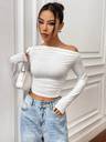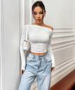 Solid Asymmetric Collar Pleated Cropped Top - Asymmetrical Neck, Ruched Design, Regular Sleeve, Casual, Plain, Long Sleeve | Full Sleeve, Crop, Slim Fit