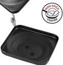 High-Quality Material: Crafted from pure grade aluminum, this sandwich toaster ensures durability and efficient heat distribution, leading to crispier sandwiches., Compatibility with Gas Stoves: This versatile cookware is designed to be compatible with gas stoves, offering flexibility in usage across different kitchen setups., Flame-Proof Design: With a 100% flame-proof body, this toaster ensures safety during cooking, offering peace of mind to users., Heat-Resistant Handle: The toaster features a handle made from heat-resistant material, providing ease and convenience during cooking and transportation., Stylish and Easy to Clean: With its elegant black finish, this sandwich toaster adds a touch of style to your kitchen while being easy to clean.