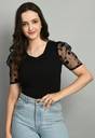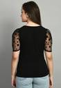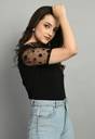 Upgrade your wardrobe with this elegant black top featuring stylish sheer polka dot puff sleeves. Crafted from a premium fabric blend, this top ensures comfort while adding a touch of sophistication to your outfit. The V-neck design enhances the neckline, making it a versatile piece for both casual and semi-formal occasions. Pair it with high-waisted jeans or skirts to create a trendy yet effortless look.