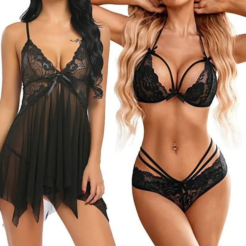 Women Short Transpanrent Nighty and Lace Lingerie Bikini Set (Bra-Panty Set) for Honeymoon, Wedding Night, Bedroom, Special nights