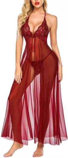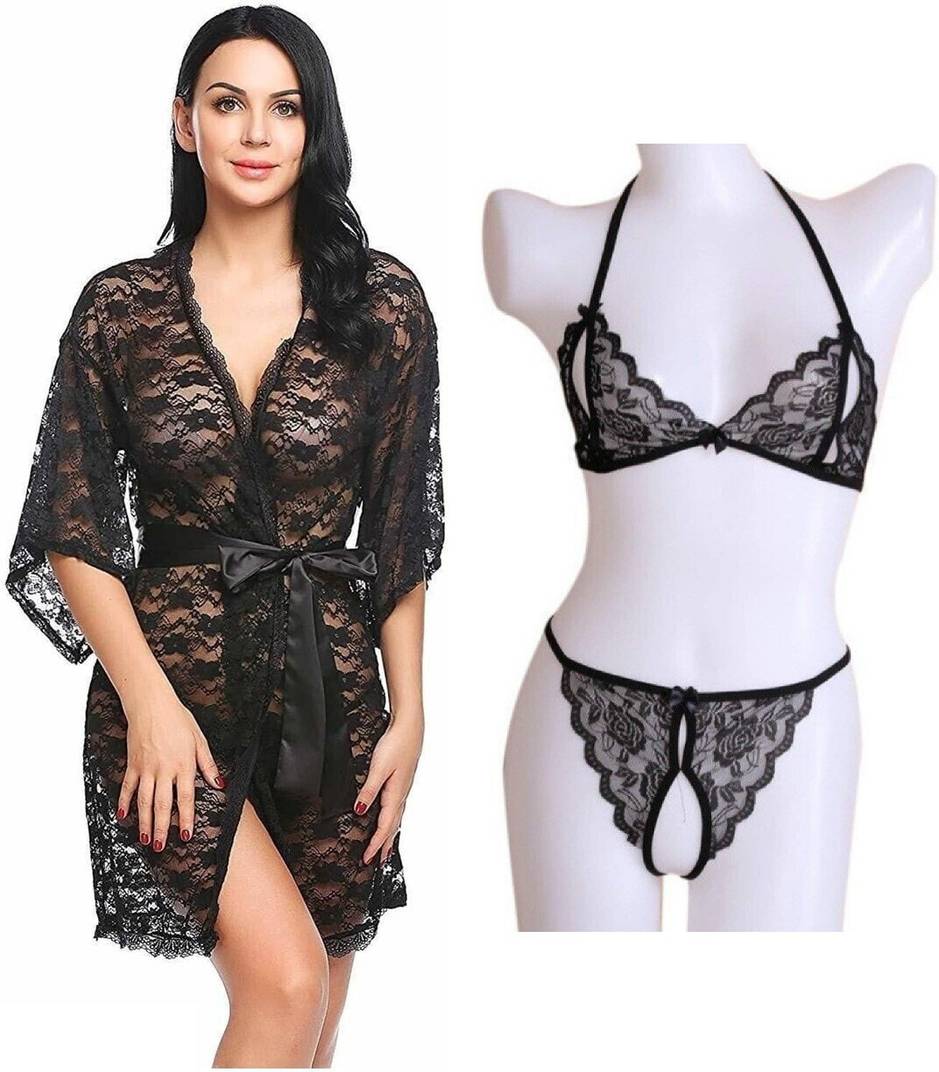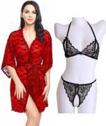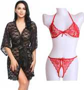 Women Babydoll Lace Robe and Lace Lingerie Bikini (Bra-Panty) Set for Honeymoon and Wedding Night