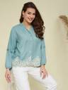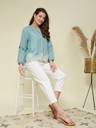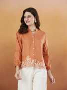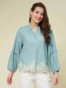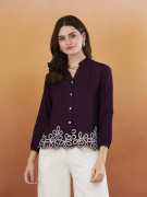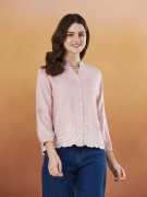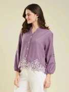 Elevate your everyday look with this stylish hip-length women's shirt featuring delicate Schiffli embroidery on the hem. Designed with a collar neck and front button closure, it offers a chic and graceful silhouette. The full sleeves with gathered cuffs add a trendy touch, while the soft, breathable fabric ensures all-day comfort. Perfect for casual outings, workwear, or semi-formal events, this shirt pairs effortlessly with trousers, jeans or skirts. Available in multiple vibrant and elegant colors and sizes from S to XXL, it’s a versatile addition to your wardrobe that brings together comfort, elegance, and timeless design.