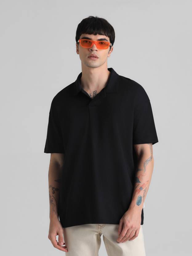 JACK & JONES Solid Men Polo Neck Black T-Shirt