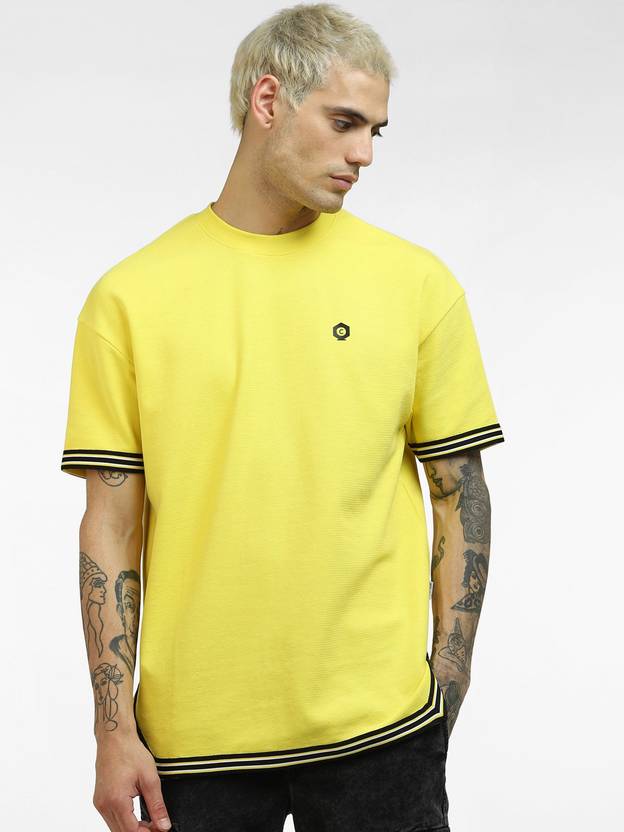 Men Solid Round Neck Cotton Blend Yellow T-Shirt
