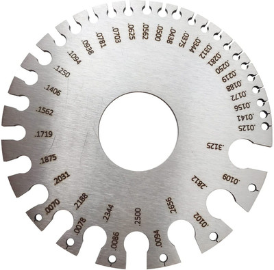A thread gauge, also known as a screw gauge or pitch gauge, is used to measure the pitch or lead of a screw thread. Thread pitch gauges are used as a reference tool in determining the pitch of a thread that is on a screw or in a tapped hole. This tool is not used as a precision measuring instrument, rather it allows the user to determine the profile of the given thread and quickly categorize the thread by shape and pitch. This device also saves time, in that it removes the need for the user to measure and calculate the pitch of the threaded item. To use a thread gauge, the user must first match the type of thread to the gauge. For example, attempting to measure metric threads with an imperial gauge will not return accurate results. To determine the correct gauge, a process of trial and error may be needed if the screw is of unknown origin. Once the correct gauge is determined, the user should extend one of the leaves of the tool and press it against the threaded portion of a screw. If the teeth (cut into the leaf) match the spacing of the thread, then the user can read off the thread pitch stamped into the leaf. If the fit is not good, the user should try a different leaf. Note that this tool is not for accurate measurement of an unknown thread, such as a hand-turned thread from a lathe. This tool is meant for a best-approximation measurement to a known thread standard