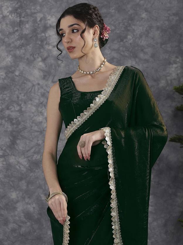 JAINICA Solid/Plain Bollywood Tissue Saree (Dark Green)