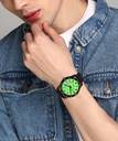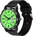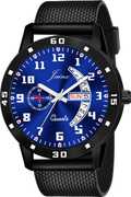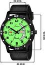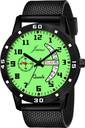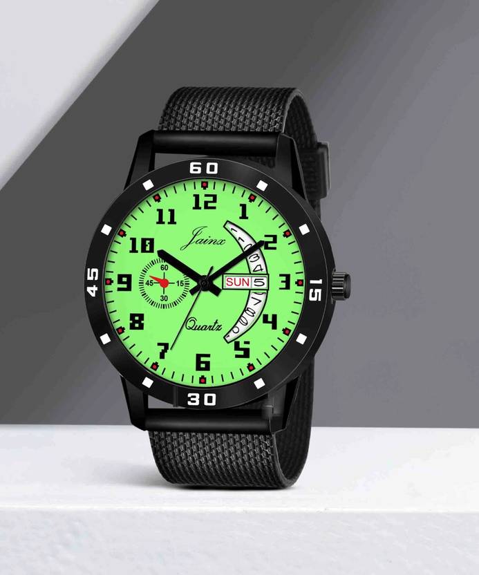 Day and Date Working Dial, Dummy Small Chronograph Printed on Dial, Time Markers Printed on Case, Comfortable Silicone Mesh Band With Buckle Clasp, Black Matt Finish Metal Case, Radium Dial: Which is glow in night