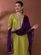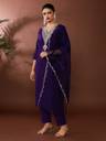 Embrace a comforting style with this Solid Embroidered Viscose Rayon Violate Kurta Sets. This Straight Kurta For Women has a V-Neck, Three-Quarter Sleeves With Zari. Paired With a Trousers.