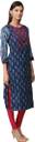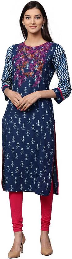 Jaipur Kurti Women Navy Blue Embroidered Straight Cotton Kurta. This Embroidered Kurta has Embroidery on Front, Contrast Trim Detail with 3/4th Sleeves & Round Neck.