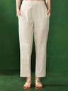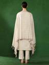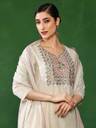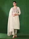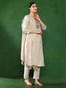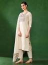 Make a statement in this Beige Mirror Work Embroidered Festive Suit Set. The cotton blend lurex kurta has a sweetheart neck with mirror work embroidered yoke, three-quarter sleeves and a straight hemline. Paired with regular straight pants and a self-woven dupatta.