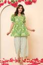 Elevate your wardrobe with this Jaipuri Bunaai green leaf-printed co-ord set, perfect for a refreshing and chic look. Designed for comfort and style, this outfit blends contemporary patterns with traditional charm, making it ideal for casual outings, brunches, and summer gatherings. Crafted with intricate detailing and breathable fabric, it promises both elegance and ease.