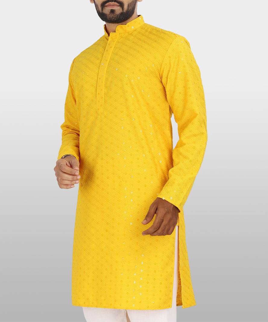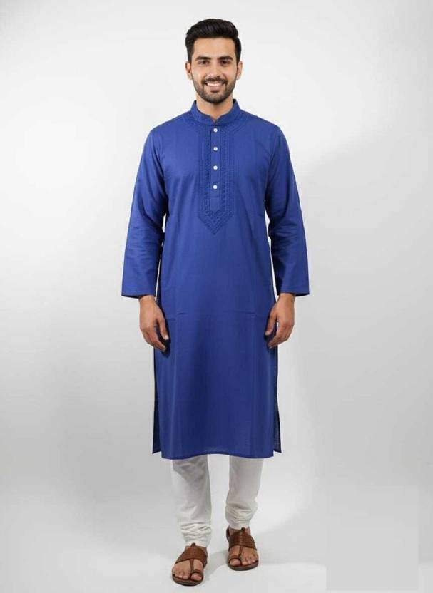 This amazing traditional wear kurta pajama has full-sleeves and button-down neckline that lends you the look of a debonair Indian men.