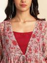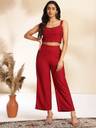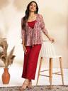 Janasya Women's Wine Solid Crop Top with Pant and Jacket radiates sophistication and style during special occasions. Crafted in a rich moss fabric, this outfit is designed to make a statement. The sleeveless crop top, features a round neck and is adorned with floral print and exquisite Gota Patti work, along with playful tassels. The coordinating straight pant is partially elastic. To complete this ensemble, a grey chiffon lurex jacket adds an element of allure and sophistication. The jacket features a captivating floral print and a handy side pocket. Embrace the allure of Janasya's Wine Solid Crop Top Set this festive season.