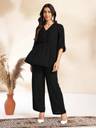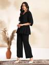 The captivating black shade is ideal for all your upcoming occasions. This sophisticated co-ord Set, made from dobby chiffon, showcases a charming floral print that enhances its appeal. Designed with a flattering waist tie-up and playful ruffles, it’s paired with a comfortable palazzo bottom, creating the perfect peplum ensemble for the season. Complete your look with a confident smile for effortless style. To maintain the vibrancy of the print and fabric, gently hand wash. This Set is a must-have addition to your wardrobe.
