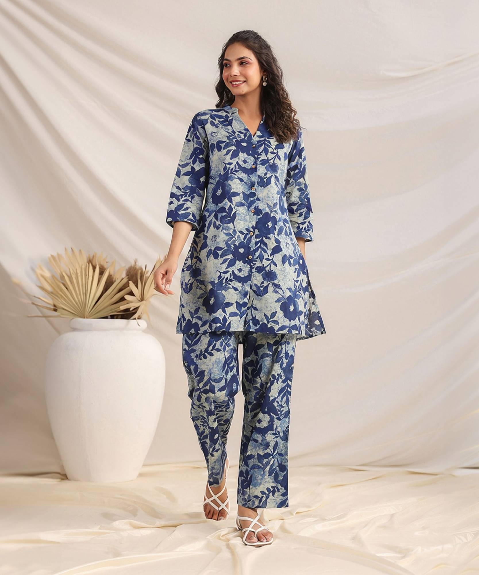 Uplift your casual wardrobe with janasya’s indigo co-ord set, the perfect blend of style and comfort. Crafted from breathable cotton in a timeless indigo hue, this set features a straight kurta with a charming batik print and a flattering mandarin collar. Designed for ease, the kurta includes a button closure and a practical side pocket, offering both elegance and functionality. Paired with matching straight pants, this ensemble is effortlessly chic. Complete the look with minimal accessories and enjoy the simple sophistication of this versatile outfit.