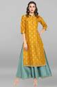 Style- Length: 52(inch), Pattern- Gold Print, Occasion- Festive & Party, Type- Anarkali, Sleeve Type- 3/4 Sleeve (Regular Sleeves), Color- Mustard