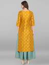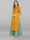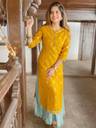 Premium Collection by Janasya. Step up your style game with this beautiful attire from Janasya. This layered dress has round neck with gold and green coloured foil print on it, 3/4th sleeves, anarkali silhouette and beautiful border on hemlines. The attached straight kurta in layover style has a tie-up on waist to enhance the waistline detailed with beautiful tassels on it. This light green piece can be matched with patent pumps and a pretty purse when you have a family function to attend.