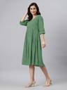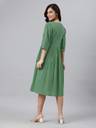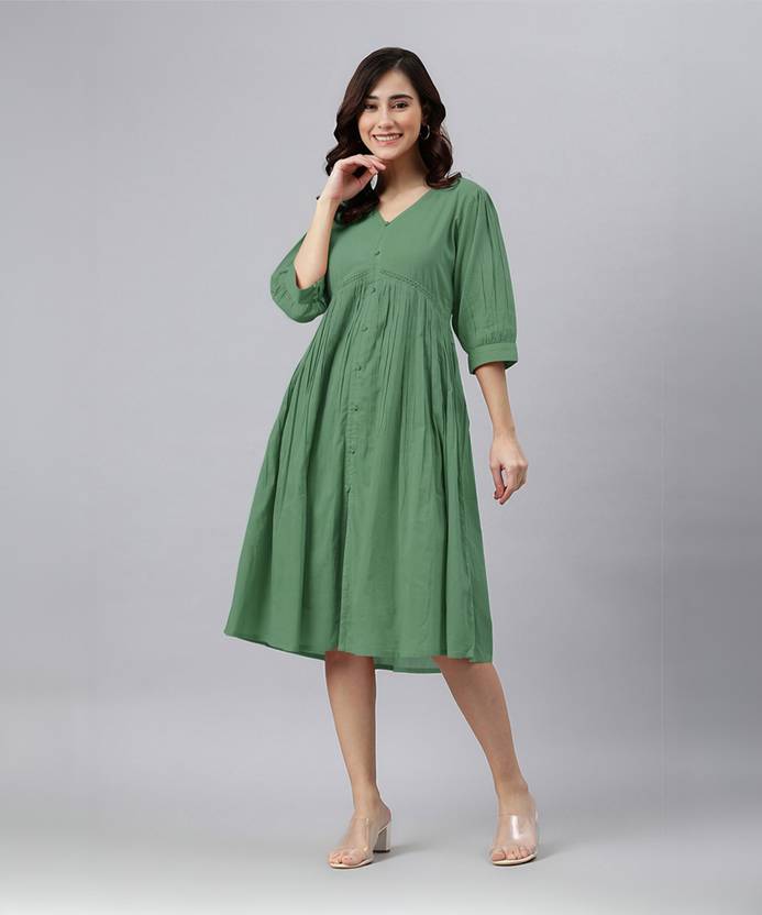 Grace your wardrobe with Janasya’s Green Cotton Gathered Dress, a perfect blend of charm and comfort. Highlighted by a chic V-neck adorned with delicate potli buttons, this Dress is all about elegance. The cuffed sleeves and intricate schiffli lace detailing add a refined touch, while the gathers under the enhance its flattering silhouette.