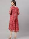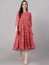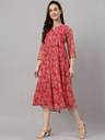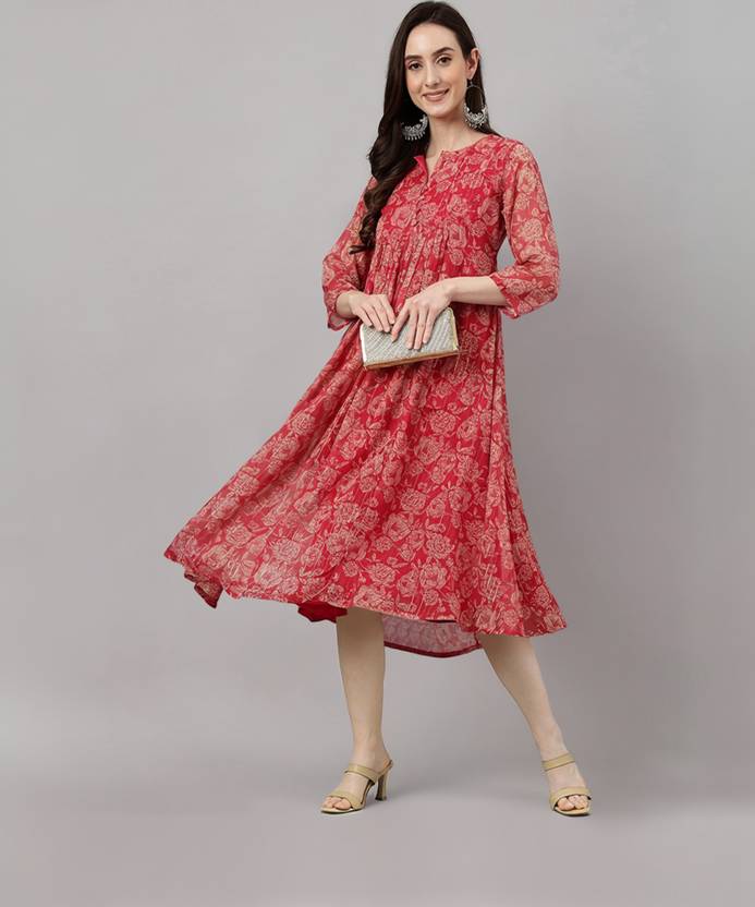 This dark pink chiffon lurex floral printed Dress by Janasya is perfect for those casual days with elegant look. It features 3/4 sleeves, a notched neckline and a calf length silhouette with gather detailing and buttons and loops on front panel. The fabric is lightweight and delicate, making it easy to move in, and the gathers add texture and shape to the product.The Dress has butter crepe lining in it
