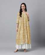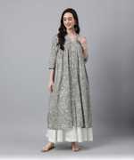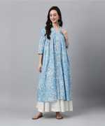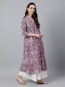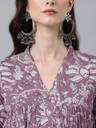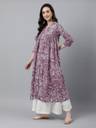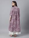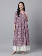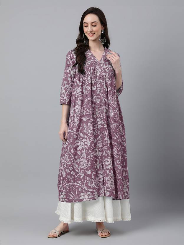 This purple floral-printed kurti is a stunning blend of style and comfort. Crafted from soft cotton, it features a flattering V-neckline and gathers above the bust for a tailored fit. With 3/4 sleeves and a flared silhouette, it offers effortless elegance. Pair it with pants or palazzo and make a bold statement on your next day out with friends!