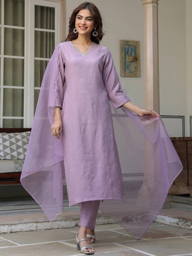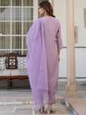 Revamp your wardrobe with this lavender embellished chinon kurta pant set with organza dupatta featuring v-neck with lace work and delicate embroidery on front panel, 3/4sleeves with straight fit. The kurta is paired with narrow pant in same fabric and light weight organza dupatta with scalloped border.