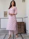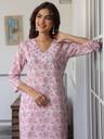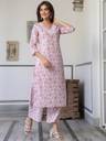 Step into effortless elegance with this pink pure cotton floral printed straight kurta bottom set from janasya. The kurta features a chic v-neck, radiating understated charm. Paired with narrow pants and a side pocket, both pieces showcase vibrant floral prints, radiating grace and style. Perfect for casual outings, this ensemble effortlessly combines comfort with sophistication.