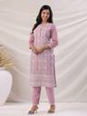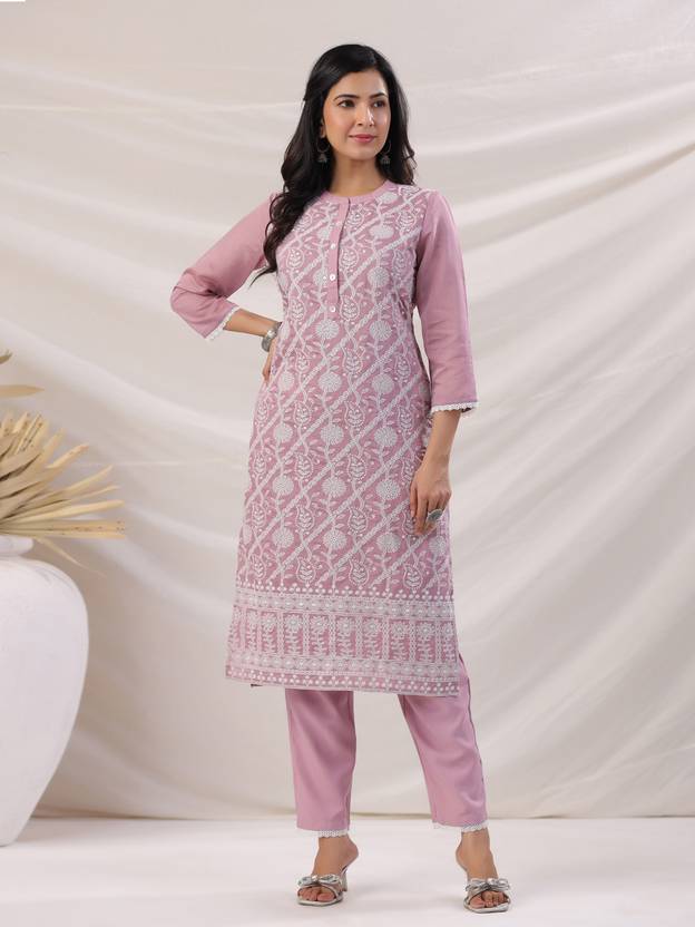 Slay and style with Janasya Kurta pant set in a rich mauve tone, the closed neck band collar with a button placket features a hook & eye closure and a full front embroidered panel. The cotton Kurta is paired with matching solid pants with intricate lace insert detailing. Combine the look with your favorite accessories for any upcoming occasion.