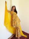Stand out in crowd with this elegant sharara set from Janasya. The set is crafted in georgette fabric with digital floral prints in yellow color. It has knee length short kurta which has V-neck with gota work detailing, potli buttons, gathers at bust level, 3/4th regular sleeves with fit and flared silhouette and has a butter crepe lining inside. The kurta is paired with printed yellow sharara with fully elasticated waistband and a solid chiffon dupatta with gota lace detailing at the borders.Adorn it with heavy earrings to complete the look and you are perfectly dressed!