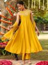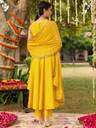 Bring a burst of sunshine to your festive wardrobe with this radiant yellow sleeveless chanderi silk kurta set by janasya. The sleeveless pleated anarkali kurta features intricate zari embroidery and sequins delicately placed on the yoke, complemented by a round neckline for a graceful finish and back neckline includes keyhole, button and loop for an ease in wearing. The ensemble includes solid yellow chanderi silk straight pants offering comfort with a refined silhouette. A breezy chiffon foil printed dupatta adorned with all-over ethnic motif foil print and gota patti lace trims at the borders completes the look with a festive sparkle. Perfect for haldi ceremonies, daytime functions, or festive get-togethers, this ensemble pairs beautifully with kundan earrings, a statement maang tikka, and embroidered juttis. Make every twirl count with janasya's contemporary yet timeless festive styles.