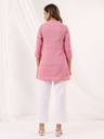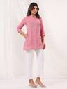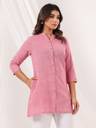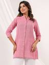 Add a pop of pink to your wardrobe with this elegant pure cotton straight short kurti. Featuring a mandarin collar with button-down detail, front slit, and practical side pocket, it’s designed for style and comfort. The 3/4th sleeves and flattering a-line silhouette make it a perfect pick for everyday chic.