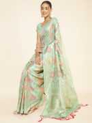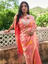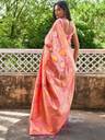 Make a statement at the function with this stunning light pink banarasi silk saree by Janasya. Its beautiful intricated with Woven Floral Design to showcases a harmonious blend of style and elegance. Enhance your overall look by pairing it with classic earrings and two shades.