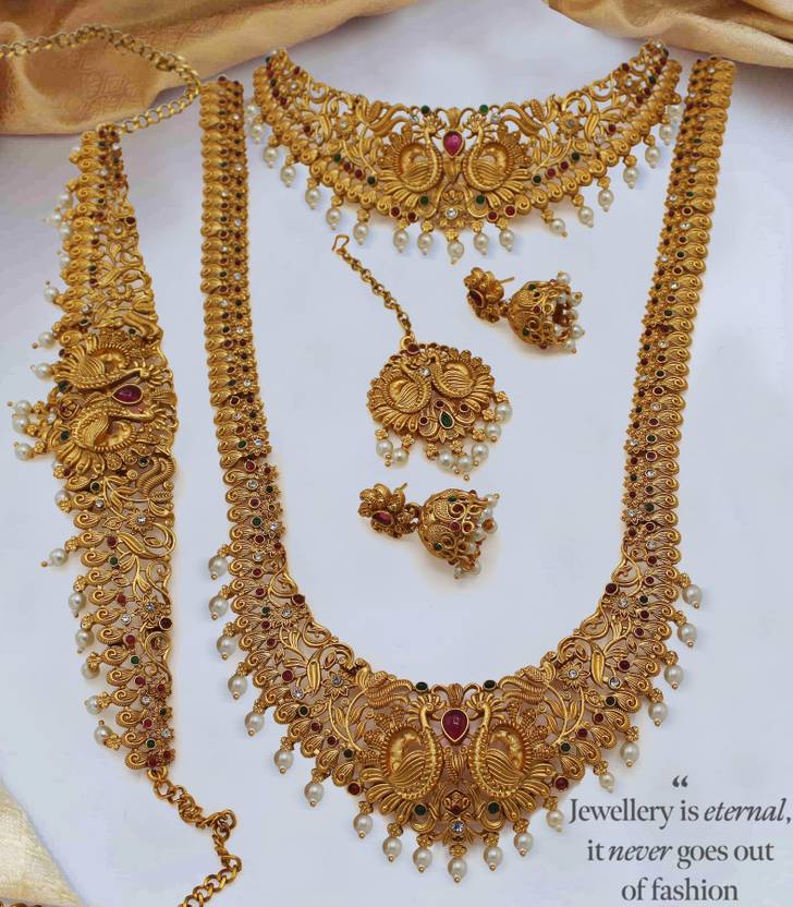 jewellery set of handcrafted gold plated traditional temple look choker necklace and mid length necklace with matching earrings. This modern jewellery set, which has been inspired by red carpet looks, can be worn with all traditional outfits and is suitable for weddings, festive and traditional occasions. jewellery sets are of superior quality and are skin friendly as they are made from toxic free materials as per international standards. Please store the jewellery safely in airtight packaging, away from moisture, water, perfume and chemicals and clean with a soft, dry cloth for long life.