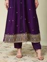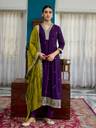 This vichitra silk suit set is designed with elegant embroidery and sequin work, giving it a graceful festive appeal. The V-neck kurta with 3/4 sleeves is paired with a dupatta that features lace detailing, making it perfect for traditional occasions and celebrations.