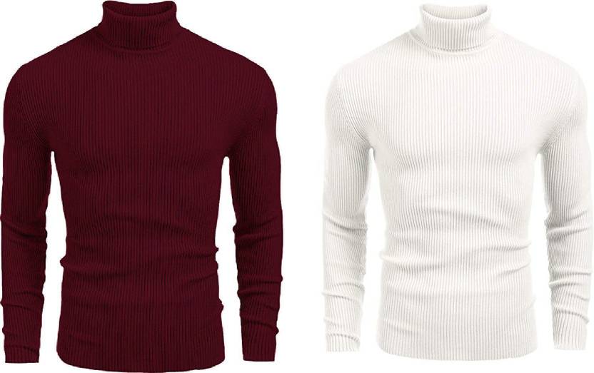 Jaqque Men Solid High Neck Maroon, White Sweater