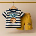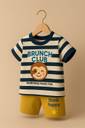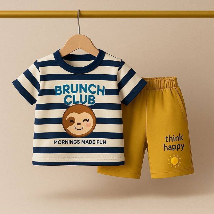 Bring on the sunshine and smiles with this Navy Striped T-Shirt and Yellow Shorts Set! Made from 100% breathable cotton fabric, this outfit keeps your little champ comfy all day long. Whether it’s playtime, brunch time, or nap time — this adorable kids boy dress is made for every happy moment. The soft striped t-shirt with “BRUNCH CLUB” print gives major cool-kid vibes, while the mustard yellow shorts add that pop of fun color. The kids clothes are crafted with lightweight, high-quality stitching, making them durable enough for all the giggles and tumbles. Perfect for summer wear, this cotton baby boy dress keeps your kiddo feeling fresh and free, even on the warmest days. Designed as a kids clothes set boy, this combo is stylish yet super easy to wear. It’s ideal for outings, playdates, and even casual photoshoots — basically, anywhere your little one wants to shine. The baby boy tshirt pant set is gentle on the skin, perfect for new born baby boy dress collections, or as a cute 1 year boy dress gift. This striped tshirt for kids is unisex and fits perfectly into your cotton kids wear boys collection — giving that relaxed, cool look every parent loves. The kids tshirt shorts set can be mixed and matched easily with other pieces too! So, if you’re searching for trendy, breathable, and comfy kids wear boys made with love and quality — this cotton baby boy dress is the one. Dress your mini trendsetter in this baby boy dress that says fun, fashion, and comfort all in one go.
