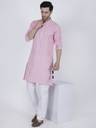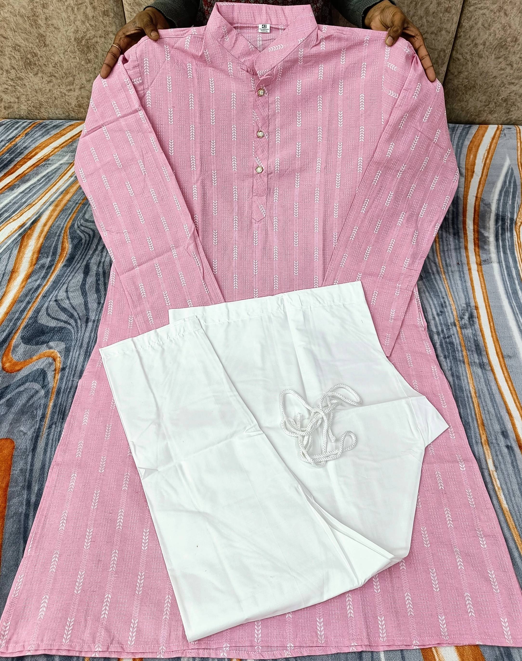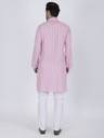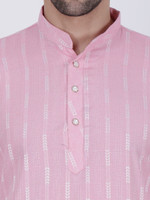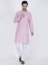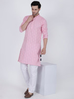Flaunting a self-design pattern on the kurta and a solid-patterned pyjama, this men's set creates a subtle contrast that feels both sophisticated and wearable. The narrow vertical stripes add visual height, lending a refined structure to the overall look. The solid pyjama balances detail with simplicity, making this outfit easy to accessorise or pair with traditional footwear.
