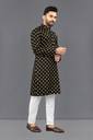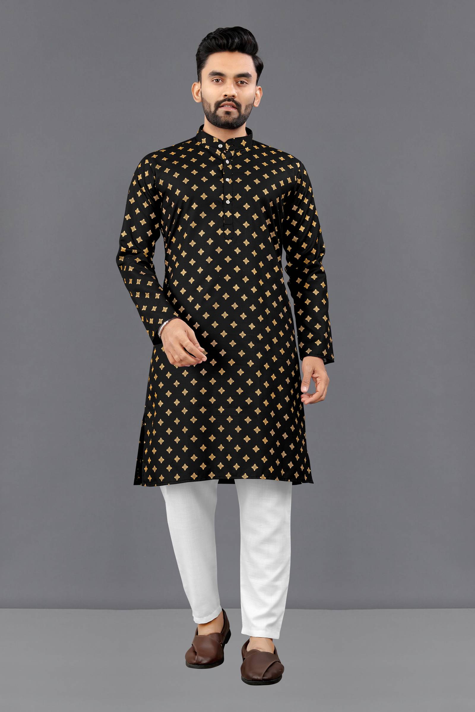 Enhance your ethnic look with this stylish foil print kurta for men, designed for festive and traditional occasions. Made from a soft cotton blend fabric, it features a subtle yet eye-catching foil print that adds a rich touch to your appearance. The straight cut and full sleeves offer a clean and elegant fit, making it ideal for celebrations, weddings, poojas, and more.
