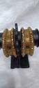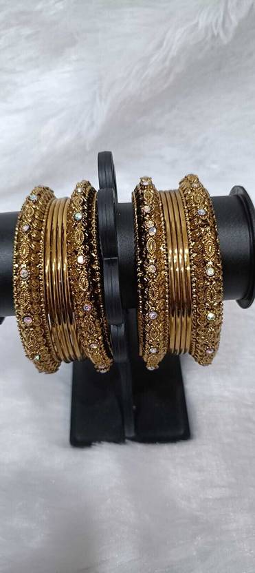 Elevate your traditional attire with this stunning set of gold-finish designer bangles. Each set includes 6 intricately crafted bangles adorned with sparkling pastel-toned stones that catch the light beautifully. With detailed embossing and a rich antique look, these bangles are the perfect blend of classic charm and festive elegance. Ideal for weddings, parties, and cultural celebrations, this combo of 2 sets (12 bangles total) ensures you stand out in style. Lightweight, skin-friendly, and versatile, these bangles complement a wide range of ethnic outfits from sarees to lehengas.