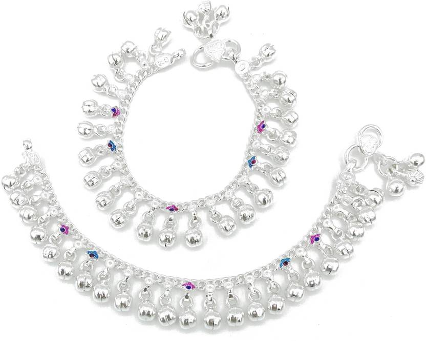 JAYEEVAGMI offer you trendy looking silver ankelet for baby girl. Silver finish ankelet secured with S hook clasp. Silver payals are very good and beautiful looking for a baby girl. Ghungharoo attached in payal makes melodius sound like cham cham.