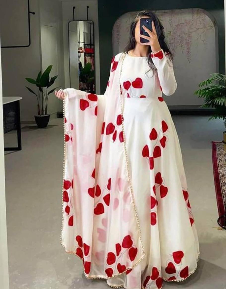 Floral Elegance: Adorned with a captivating floral design, this maxi gown is a perfect blend of beauty and grace. Full-Sleeve Styling: The gown features full sleeves for a touch of sophistication, making it suitable for various events., Premium Georgette Fabric: Revel in the luxurious feel of high-quality georgette fabric that drapes beautifully and offers all-day comfort., Versatile Occasions: From casual outings to grand weddings, this gown adapts seamlessly, making it a versatile addition to your wardrobe., Comfortable Fit: Look stunning without compromising on comfort, thanks to the lightweight and breathable fabric., Dupatta Included: The set includes a matching dupatta, adding a layer of elegance to your ensemble., Easy Care: Enjoy the beauty of this gown with simple care instructions, ensuring you shine at every event.