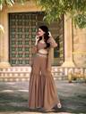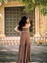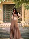 Crafted from georgette fabric, this set offers a graceful drape and fluid movement. The fabric choice ensures lightness while maintaining a polished appearance for long hours of wear. Additionally, its smooth texture supports the elaborate cuts, while complementing the detailed craftsmanship and enhancing the overall charm of this ensemble.
