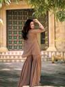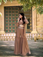 Sporting a V-neck crop top, a high-waist sharara bottom, and a three-quarter sleeve ethnic jacket, this set blends classic and modern styling. This combination of a fitted crop top and flowing pants ensures an impressive shape. Additionally, the jacket adds structure while complementing the other elements of this outfit. Moreover, each component is tailored to contribute both individuality and harmony within this full ensemble.
