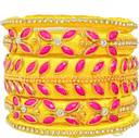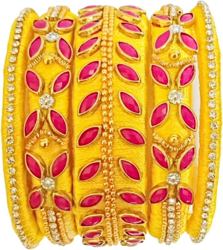 Stone Decorated Designer Beaded Silk Thread Bangles - Handmade & bangles are attractive and eye catchy with effect of glitter stones Colourful Elegant and trendy, it makes you look so amazing during festival Jeffrey Pink Decorated bangles are used for "All Occasion Jewellery". It is a festival or a party or an outing, these bangles always enhance your personality very pretty. Material: silk thread Type: Decorative with stones Colors : Yellow With Pink