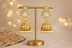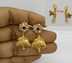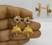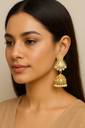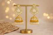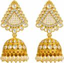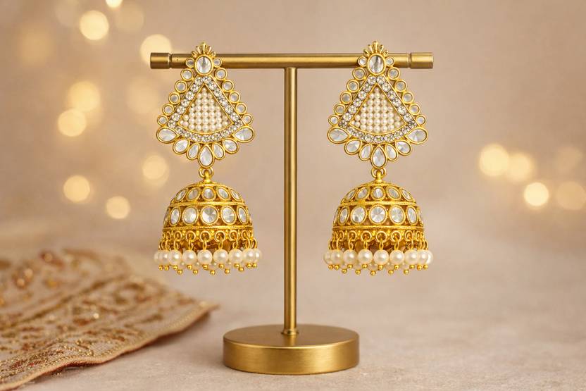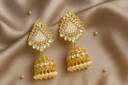 Elegant gold-toned jhumka earrings featuring a triangular stud with pearl and stone detailing, finished with a dome-shaped drop and delicate pearl hangings—perfect for festive and traditional wear.
