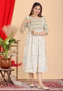Owing to its beautiful mirror work on the neck, the Jaishree Fab Women's Printed Ethnic Dress exudes an air of elegance and sophistication. Moreover, the intricate mirror work on the neckline is a traditional Indian embroidery technique known as shisha embroidery, which involves attaching small mirrors or reflective pieces onto the fabric to create a dazzling effect. Furthermore, this kurta also has a round neck with a yoke and block print, which adds to its overall charm. Additionally, the print on the borders of this kurta is particularly eye-catching and adds a pop of colour to the outfit. Not to mention, the minimal print on the rest of this kurta gives it a balanced and sophisticated look. Lastly, the two side slits on this kurta make it easy to move around in, while the calf-length design offers a touch of elegance and coverage.
